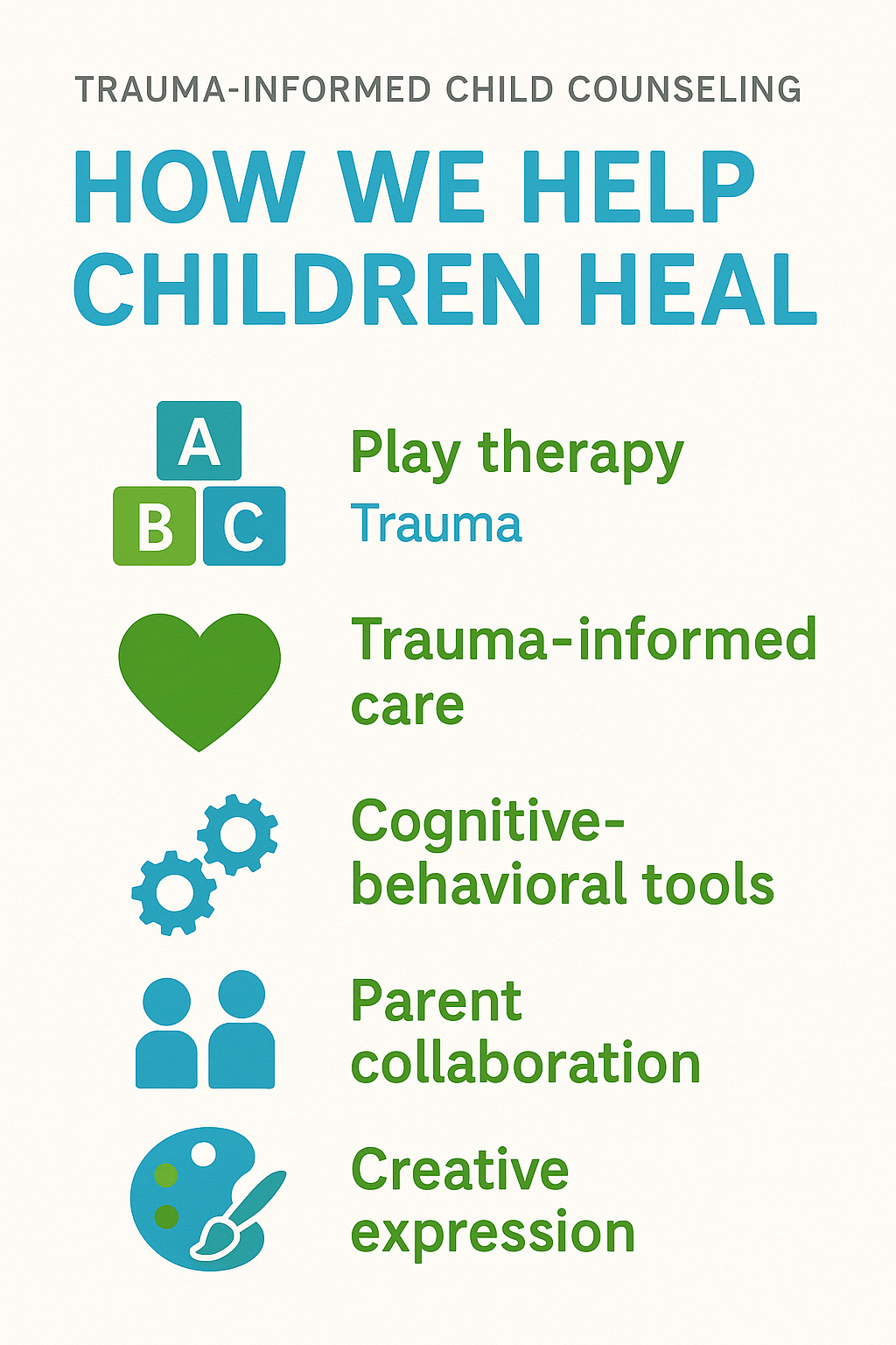 Our child counselors use evidence-based and trauma-informed methods to create a safe, trusting environment where children can heal and grow. Approaches may include play therapy, cognitive-behavioral strategies, parent collaboration, and creative expression techniques.