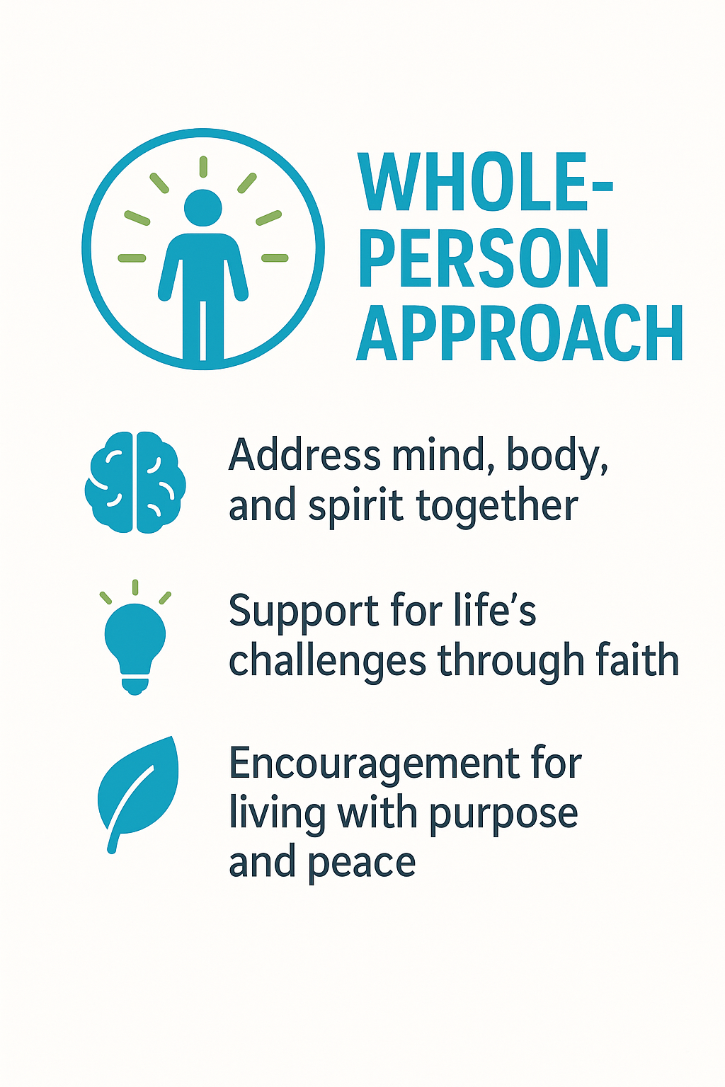 Our whole-person, Christian counseling approach integrates faith and clinical excellence. Your counselor attends to mind, body, and spirit, combining evidence-based therapies with biblical wisdom, prayer, and Scripture upon request. We explore habits that support wellness—sleep, movement, nutrition, and community—and help you apply Christian practices that cultivate peace, resilience, and purpose. Sessions move at your pace and respect your denominational background. The goal: practical progress that strengthens emotional health and deepens your walk with Christ in daily life.